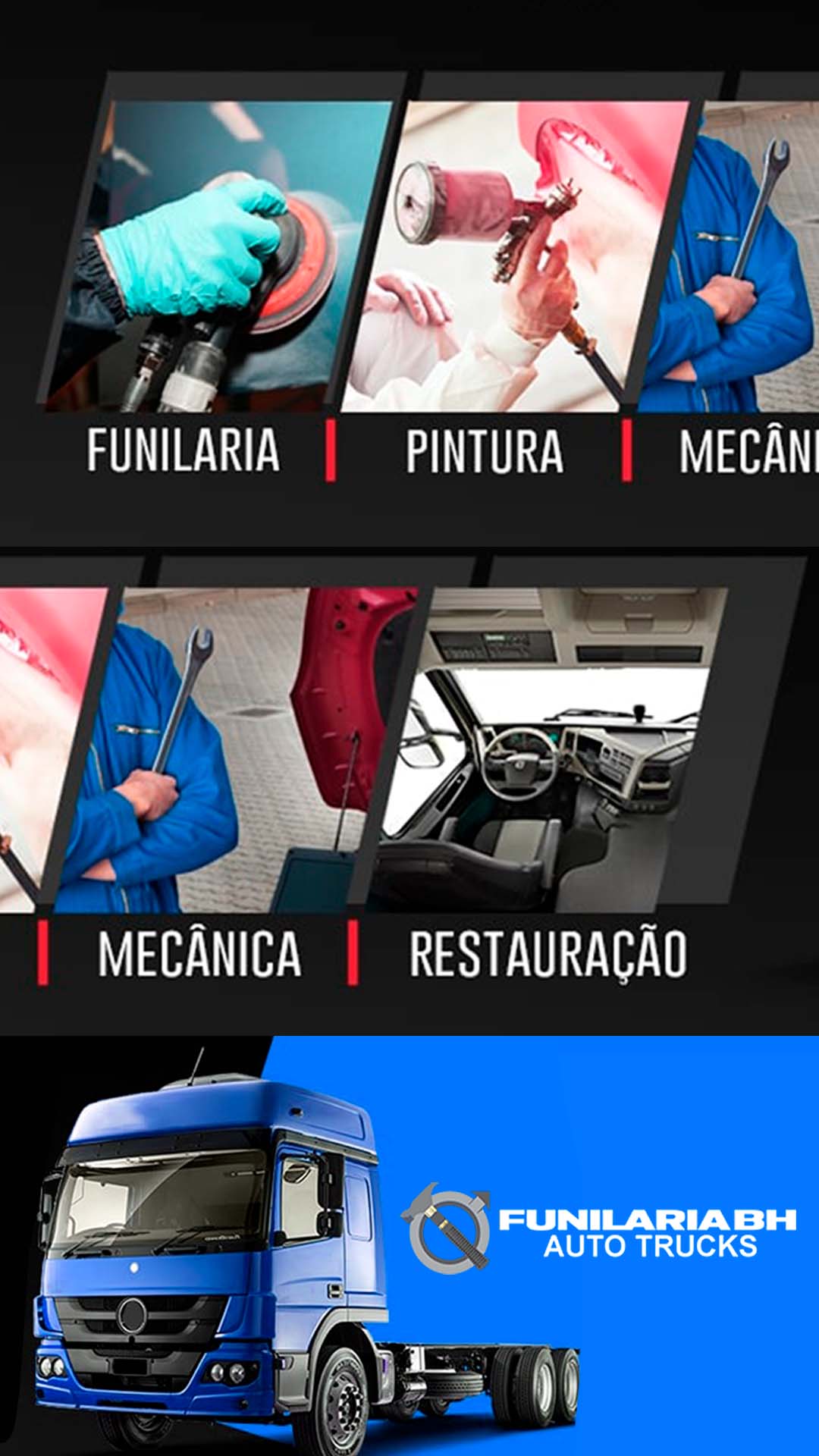 “Quer segurança e agilidade na reforma do seu caminhão? Conte com a Funilaria BH Auto Truck! Oferecemos consultoria especializada e explicamos todo o serviço de desempenho e funilaria para você decidir com total confiança. Transformamos seu veículo batido em um ativo pronto para o trecho. Sua satisfação é o nosso compromisso!”